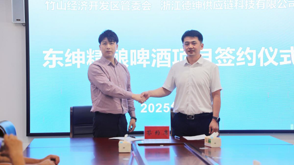 9月1日,竹山经济开发区与浙江德坤供应链科技有限公司举行东绅精酿啤酒项目签约仪式,此次签约以“两个月洽谈、一周落地”的“竹山速度”,印证了我县优质的营商环境与得天独厚的自然水资源优势对企业的强大吸引力。经济开发区管委会主任程臣,浙江德绅供应链科技有限公司董事长鲁明星出席签约仪式。