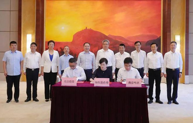 昨天上午,江苏省南通市如东县政府与北京燕京啤酒股份有限公司、天启投资有限公司签署合作协议,总投资36亿元的燕京啤酒生产基地项目落户如东。市委书记吴新明出席签约仪式并会见北京燕京啤酒集团有限公司党委书记、董事长耿超,天启投资有限公司董事长李佰清一行。