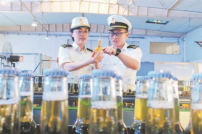 海关关员现场监管出口啤酒 (王玲玲/图)