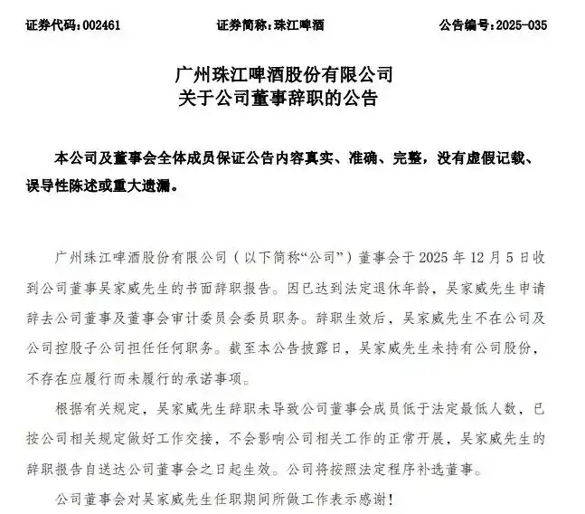 日前,珠江啤酒(002461.SZ)发布公告称,董事吴家威因已达到法定退休年龄,辞去董事及董事会审计委员会委员职务。公告强调,其辞职不会影响董事会正常运作及公司经营。
