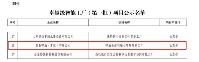 2025年01月03日 10:39 山东 图片 近日,工业和信息化部公示了卓越级智能工厂(第一批)项目拟认定名单,我区青岛啤酒(枣庄)有限公司的啤酒全流程精益管理智能工厂成功入选,全市唯一。 青岛啤酒(枣庄)有限公司作为青岛啤酒精心打造的全球顶尖数字化啤酒生产基地,拥有国际先进的自动化生产设备、智能终端和工业机器人,利用物联网、云计算、大数据及人工智能等先进技术,已建成国内啤酒行业生产速度最快、智能化水平最高的生产线。 啤酒全流程精益管理智能工厂通过集成高效节能设备、自动化控制过程分析、智能传感、生产制造执行、机器人、智能仓储等技术,构建了集资源管理、生产制造和质量管理等一体化智能制造管控体系。目前,工厂关键设备数控化率和联网率均达到100%,生产效率提高20%,资源综合利用率提高18%,产品不良品率降低40%,库存积压减少21%,单位产值综合能耗降低17%。 近年来,区工信局先后培育了国家级智能制造场景1家,省级智能工厂1家,车间2家,优秀智能制造场景3家。下一步,区工信局将按照《智能工厂梯度培育行动实施方案》要求,鼓励指导工业企业开展数字化改造,建设一批基础级智能工厂,积极争创先进级和卓越级智能工厂,加速推动全区制造业产业模式和企业形态根本性转变。