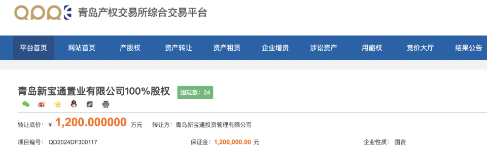 青岛新宝通投资挂牌转让新宝通置业100%股权,底价1200万元