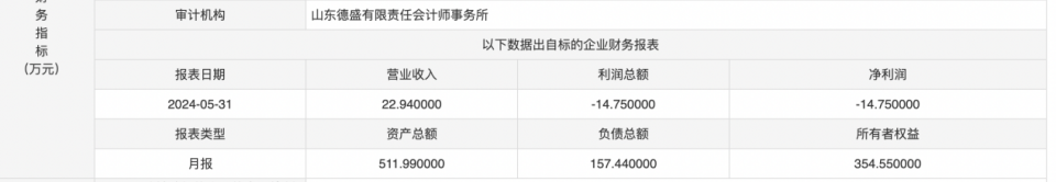 据2024-05-31财务报表显示,标的企业营业收入22.94万元,净利润-14.75万元,资产总额511.99万元,负债总额157.44万元。