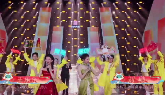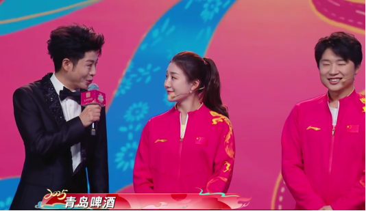 舞台上,主持人对陈梦说道:“而且你想啊,回到了家,跟朋友啊,家人啊,吃着年夜饭,再喝一口非常纯正地道的青岛啤酒,哈哈 哎呀,那感觉太姿了啊,是不是?”