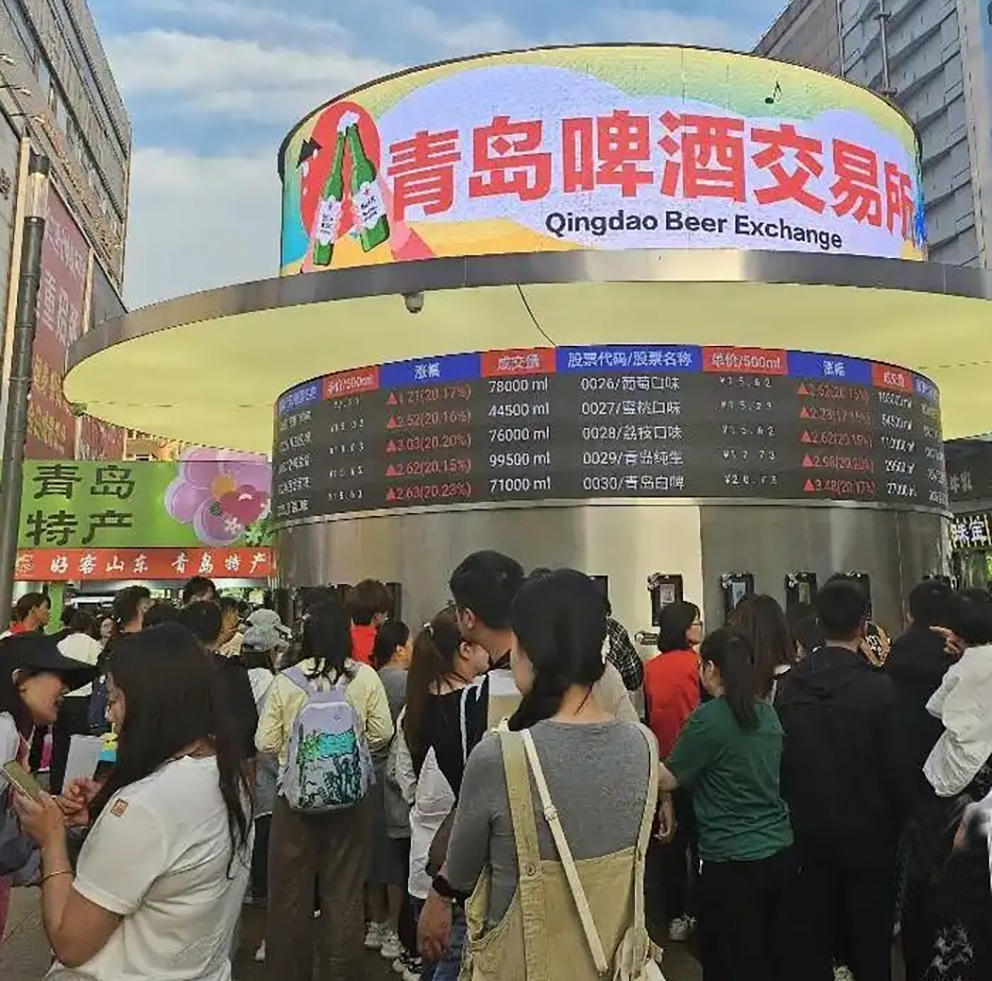 刚刚过去的端午假期,在青岛台东步行街,“青岛啤酒交易所”火爆出圈,在社交媒体平台相关话题成为顶流。这座巨大的啤酒装置上方滚动着在售啤酒的实时价格,啤酒价格上涨时显示红色,啤酒价格下跌时显示蓝色。现场不少市民紧盯大屏幕,了解啤酒价格,并根据时价和口味偏好下单。