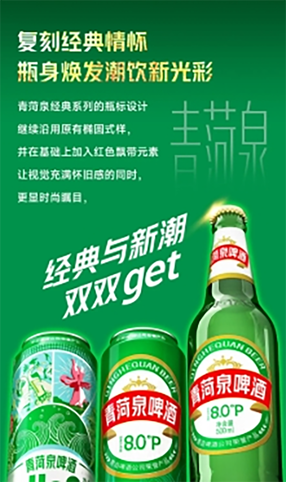 对于承载着厚重记忆的青菏泉经典系列瓶装产品,青岛啤酒在致敬经典的同时注入新意,瓶标延续了消费者熟悉的原有椭圆式样,保留了那份亲切的怀旧感。点睛之笔在于巧妙地融入了现代感十足的红色飘带元素,宛如一条连接过去与未来的纽带。这一设计让经典瓶身在视觉上既饱含深情回忆,又焕发出时尚瞩目的新光彩,真正实现了“经典与新潮双双get”。