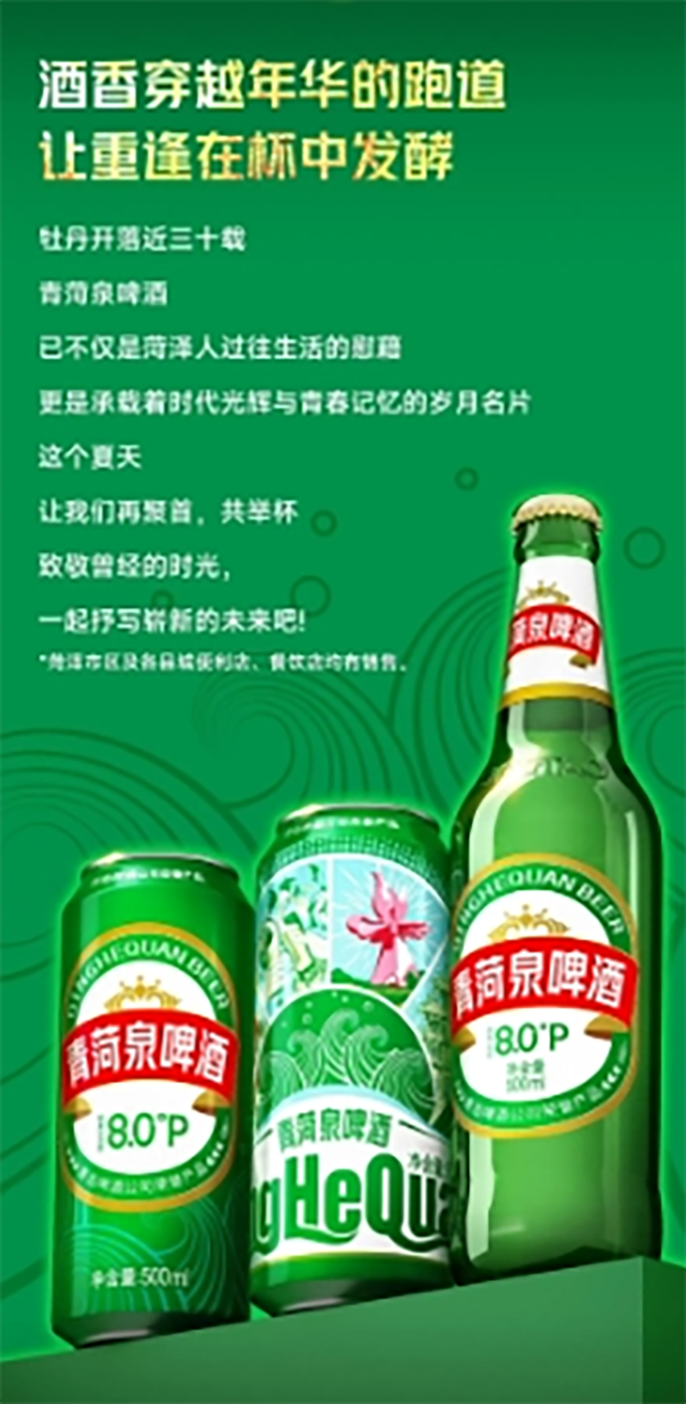 这个夏天,菏泽的街头巷尾,注定将被那一抹翡翠绿与牡丹紫点亮。熟悉的麦香再度弥漫,召唤着旧友新朋。让我们再聚首,共举那杯盛满城市记忆与焕新活力的青菏泉啤酒。