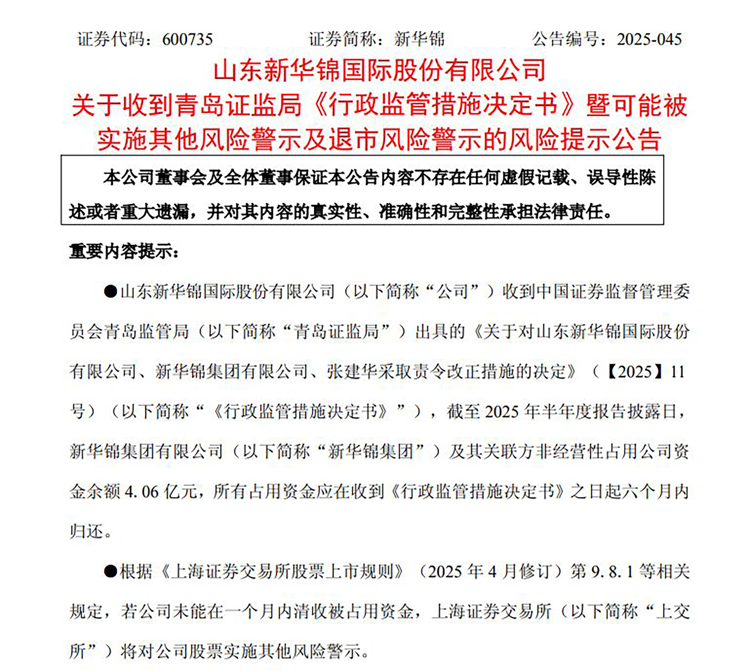 被大股东占资4.06亿未还 或将导致公司面临退市风险 从公告来看,新华锦集团及其关联方非经营性占用上市公司资金,占用时间为2025年1月1日到2025年6月30日;但如今,截至2025年半年度报告披露日,占用资金余额仍有4.06亿元未还。