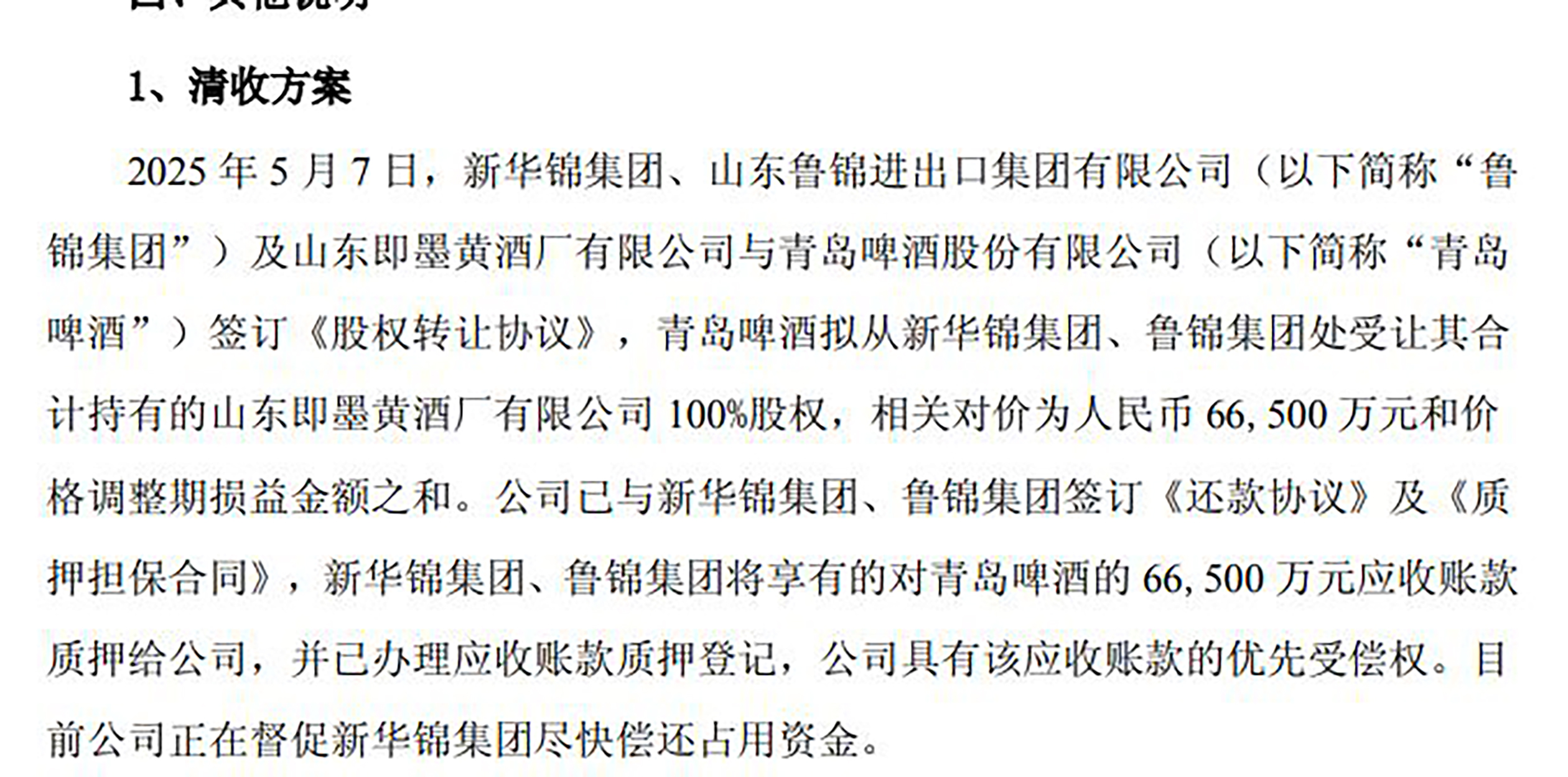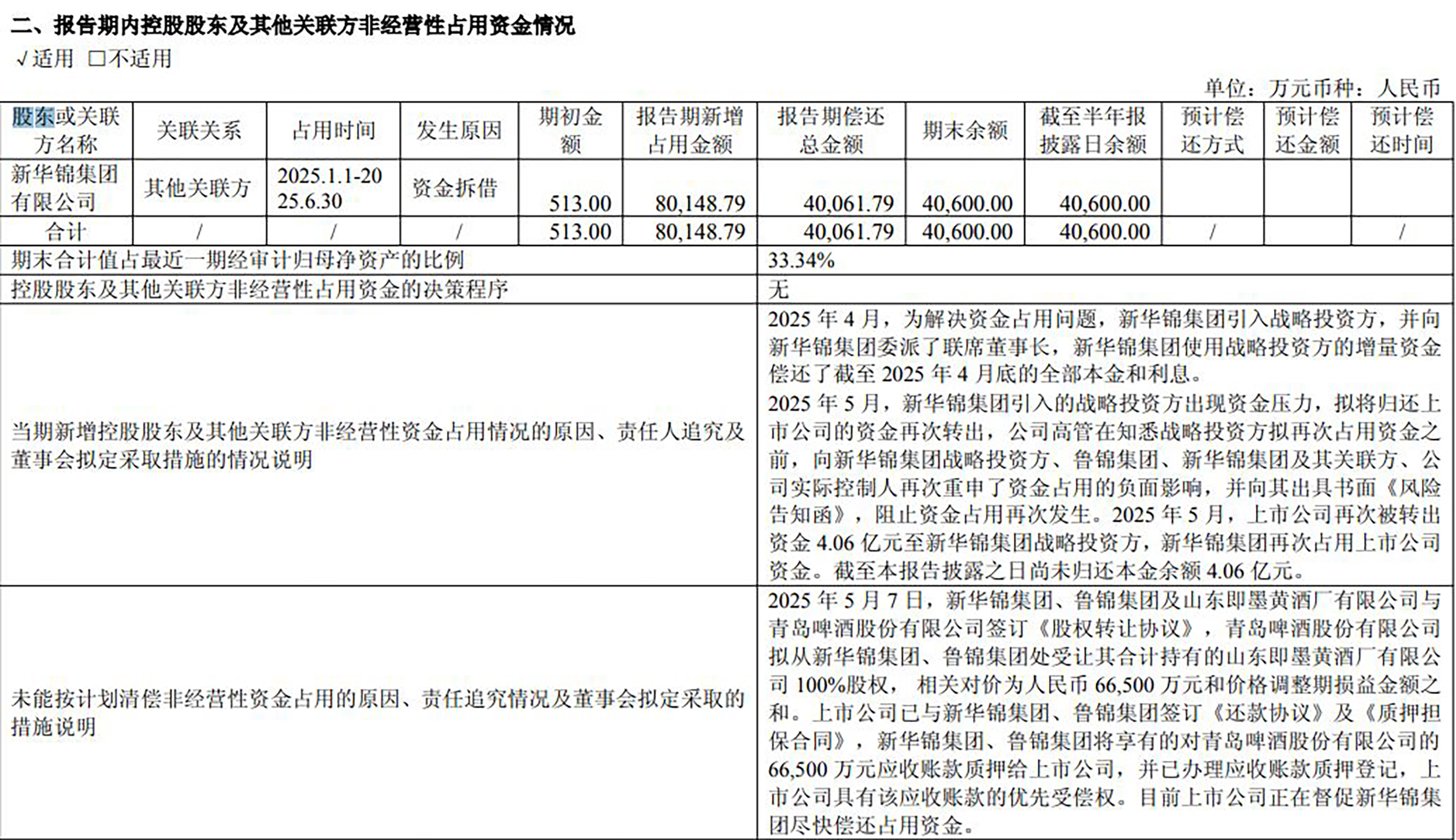 新华锦称,同样是在5月,公司已与新华锦集团、鲁锦集团签订《还款协议》及《质押担保合同》,新华锦集团、鲁锦集团将享有的对青岛啤酒的6.65亿元应收账款质押给上市公司,并已办理应收账款质押登记,公司拥有该应收账款的优先受偿权。目前上市公司正在督促新华锦集团尽快偿还占用资金。