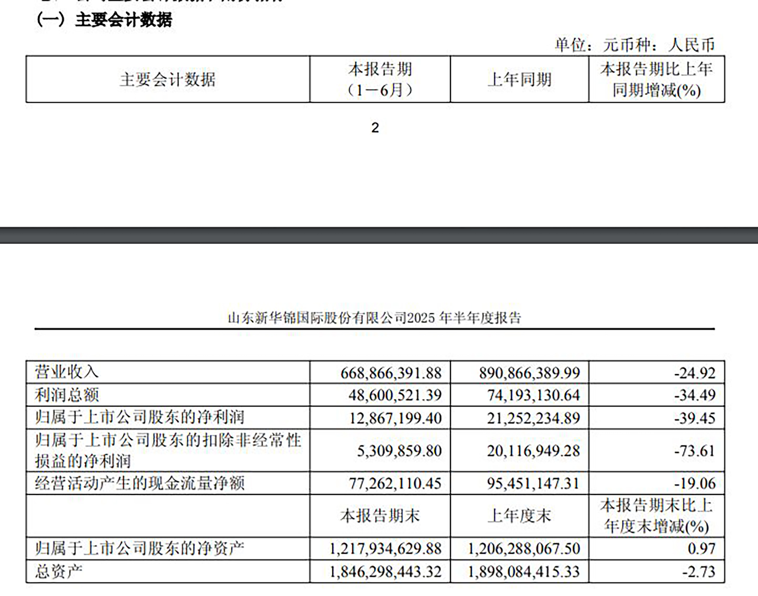 资金占用问题曝光的同时,新华锦上半年的业绩表现也不尽如人意。今年上半年,公司实现营收约6.69亿元,同比下滑24.92%;归属于上市公司股东的净利润约1286.72万元,同比下滑39.45%;扣非净利润仅约530.99万元,同比大幅下滑73.61%。此外,公司的会计工作负责人及会计机构负责人未签署保证半年度报告真实、准确、完整的书面确认意见。