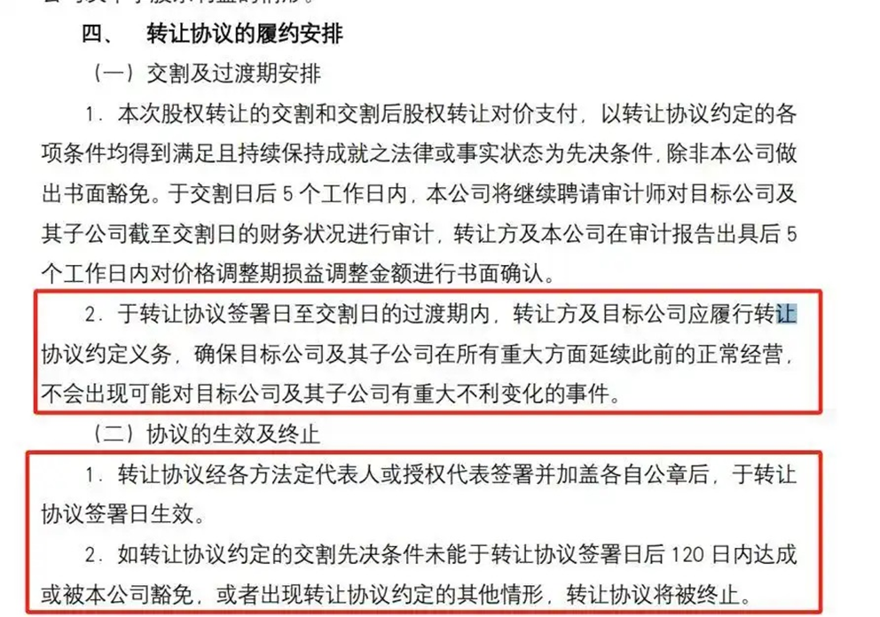 根据双方签订的《股权转让协议》,在转让协议签署日至交割日的过渡期内,转让方和标的公司在所有重大方面要延续此前的正常经营,同时不会出现有重大不利变化的事件。同时,若交割先决条件未能在协议签署后120日内(即截至9月上旬)达成或被青岛啤酒豁免,协议将自动终止。