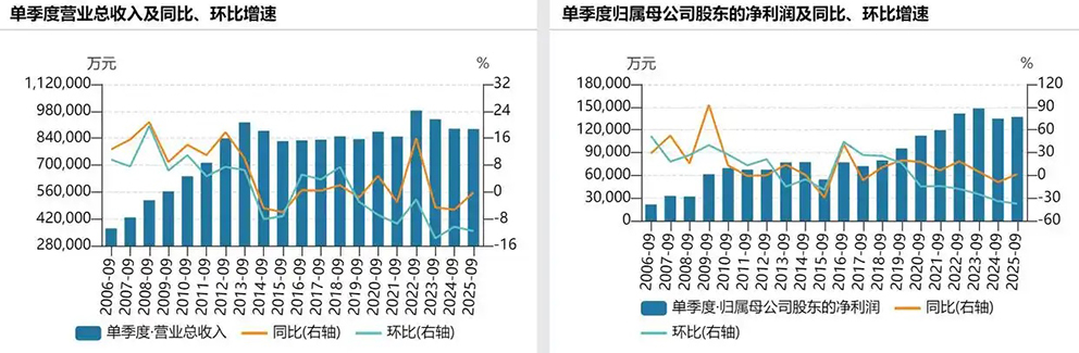 单季度来看,第三季度公司实现营业收入88.76亿元,同比下降0.17%;归母净利润13.7亿元,同比增长1.62%。