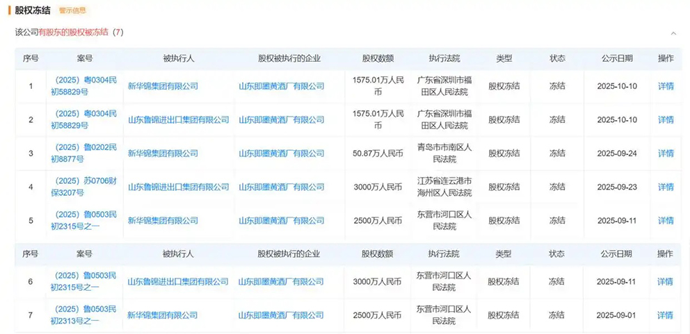 值得关注的是,天眼查显示,自今年9月以来,即墨黄酒接连新增多项股权冻结事项,当前累计被冻结股权数额超1亿元。