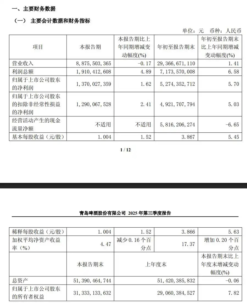 10月27日,青岛啤酒股份有限公司(青岛啤酒,600600.SH)披露2025年第三季度报告,公司前三季度实现营业收入293.67亿元,同比增长1.41%;归母净利润52.74亿元,同比增长5.70%。