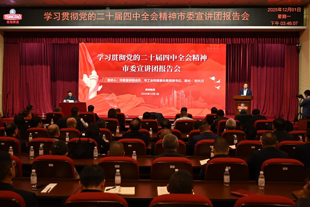 刘大川以《深入学习贯彻党的二十届四中全会精神 奋力谱写“十五五”现代化强市建设新篇章》为题,围绕党的二十届四中全会精神的重要意义,“十五五”时期在基本实现社会主义现代化进程中的重要地位,“十五五”时期经济社会发展的指导方针、主要目标、战略任务、重大举措和根本保证等方面,进行了全面深入解读。立足全市制造业发展实际,对深刻理解“十五五”时期全市工业和信息化发展的主要目标和战略任务,高质量建设创新型产业体系,进行了系统阐释、提出了具体措施。结合全会精神,对青啤集团坚持创新驱动发展战略、强化战略整合、持续打造世界一流企业三个方面提出指导性意见。