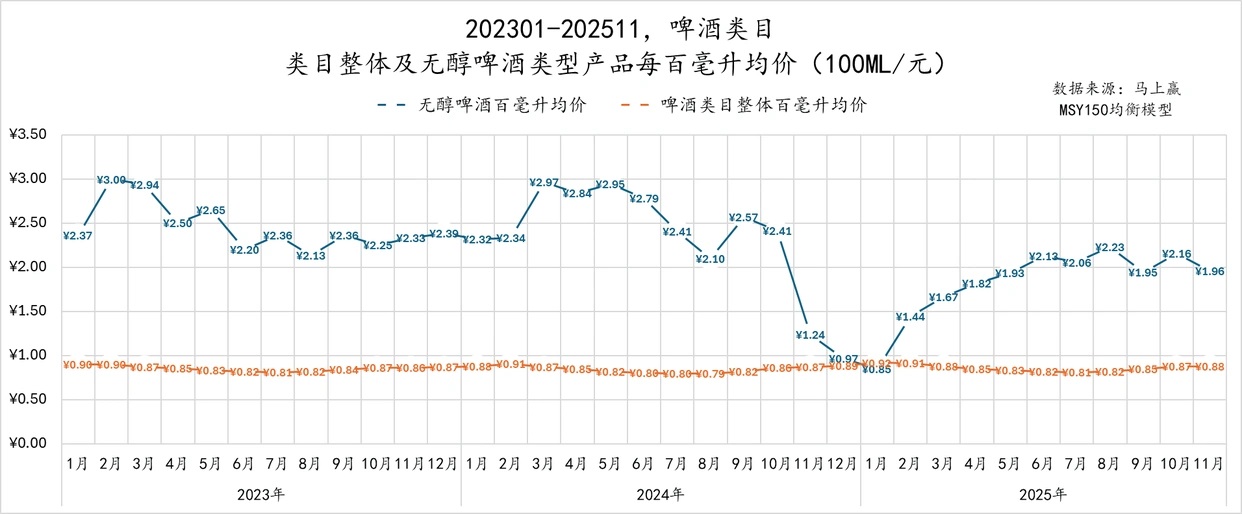 无醇啤酒与啤酒类目整体的百毫升均价对比马上赢供图