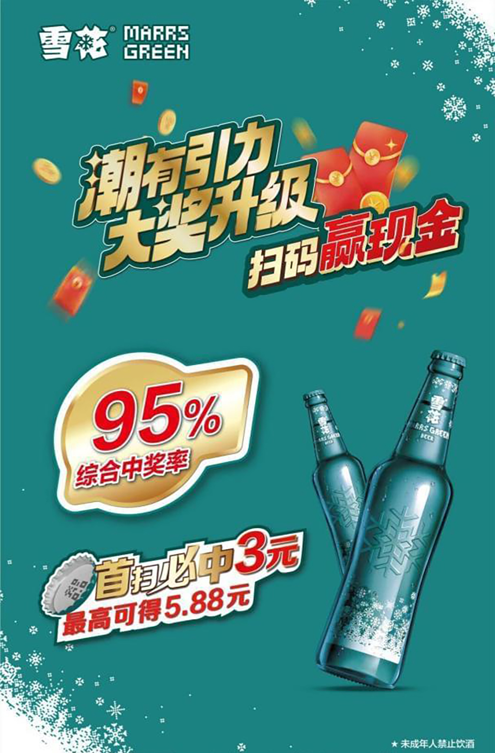 针对夏日啤酒消费高峰,雪花啤酒2025年为马尔斯绿455ml瓶装打造专属扫码活动,以即时激励为核心,结合社交裂变与时段性刺激,实现销量与品牌粘性双提升。
