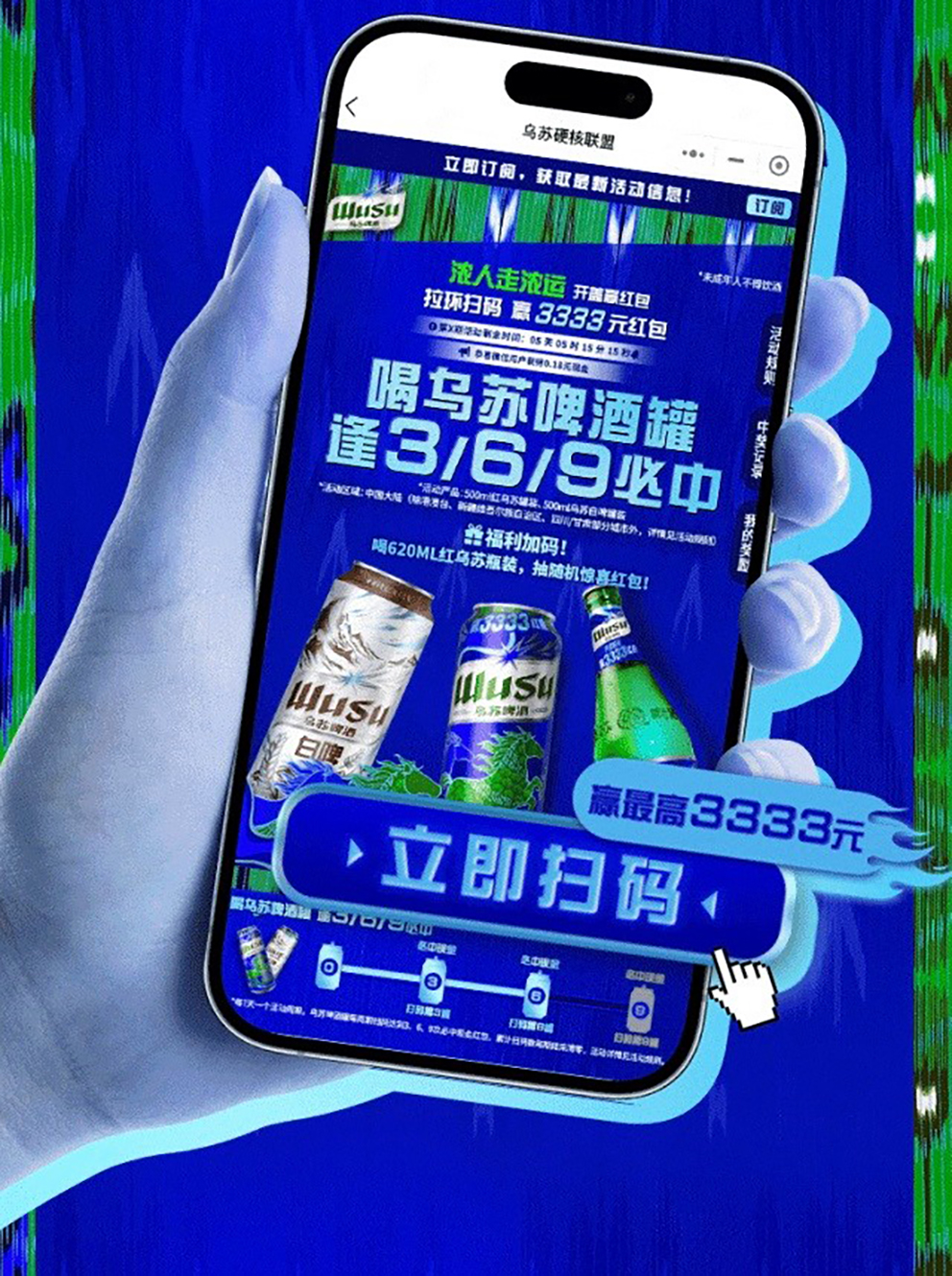 购买红乌苏500ml罐装、乌苏白啤500ml罐装,拉环扫码有机会赢3333元大额红包;设置阶梯式奖励机制,每周扫满3罐、6罐、9罐即可100%获奖;红乌苏620ml瓶装开盖扫码可抽取随机惊喜红包,降低参与门槛。