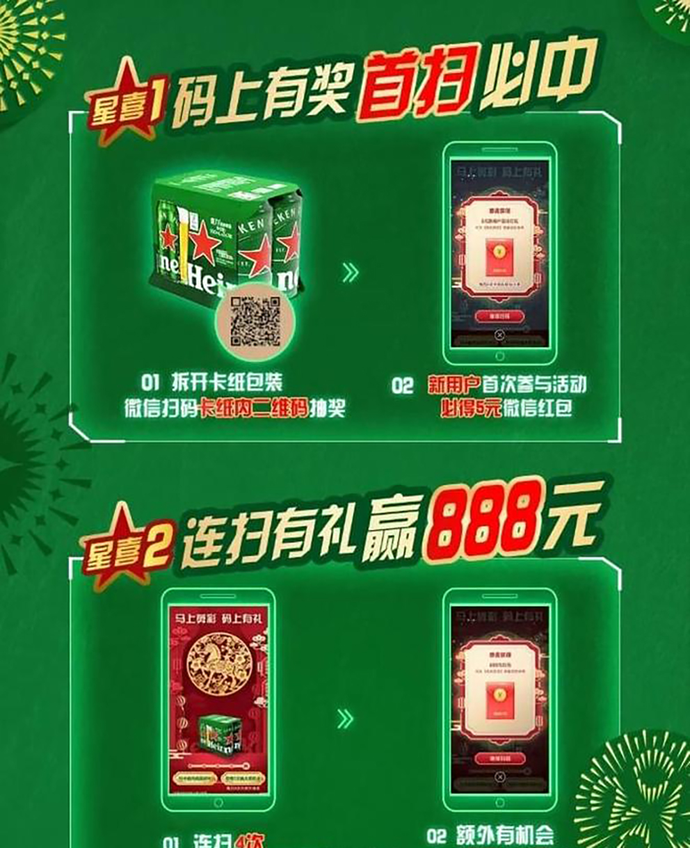 2025年春节期间,喜力啤酒摒弃“全国一盘棋”的营销模式,基于一物一码技术实现区域精准投放,针对河南、江苏等核心市场设计差异化扫码策略,有效提升区域转化效率。