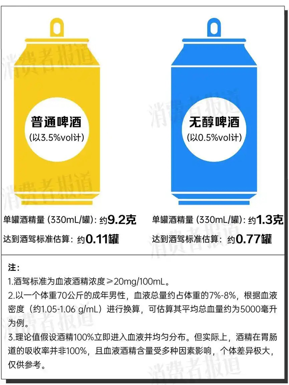 以一个体重70公斤的成年男性为例,其血液总量约占体重的7%-8%。根据血液密度(约1.05-1.06 g/mL)进行换算,可估算其平均总血量约为5000毫升。在理论假设(即酒精100%被迅速吸收并均匀分布于血液)下计算,仅需摄入约1克酒精,血液酒精浓度便可达到20mg/100mL的酒驾标准。以此换算,饮用0.11罐(注:330mL装,下同)普通啤酒或0.74罐无醇啤酒,理论上即可能构成酒驾。但需要说明的是,现实中,酒精在胃肠道的吸收率并非100%,且个体代谢差异巨大。不过,研究表明,即使摄入少量酒精,血液酒精含量达不到酒驾标准,也会对驾驶员的反应力和判断力产生影响。