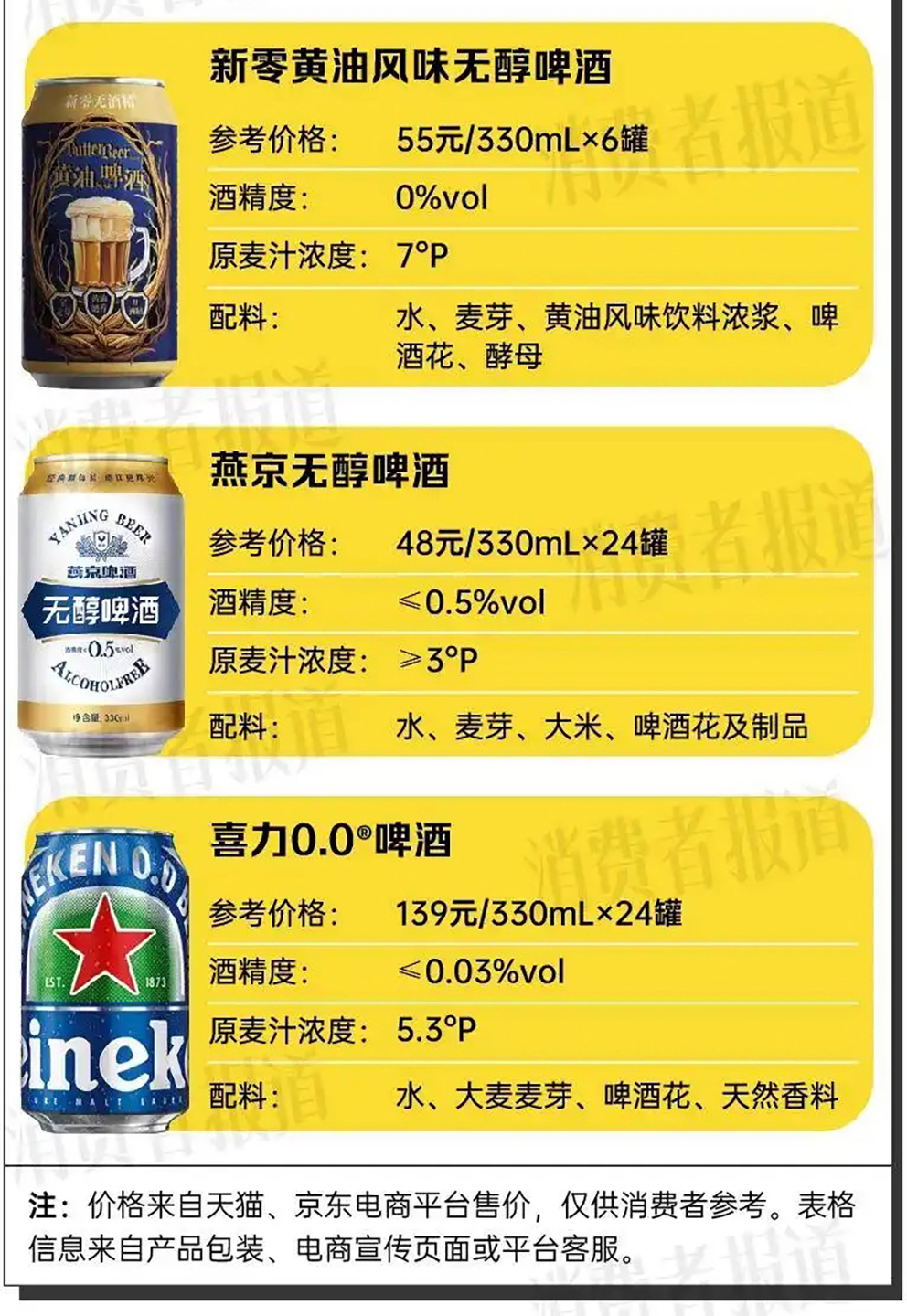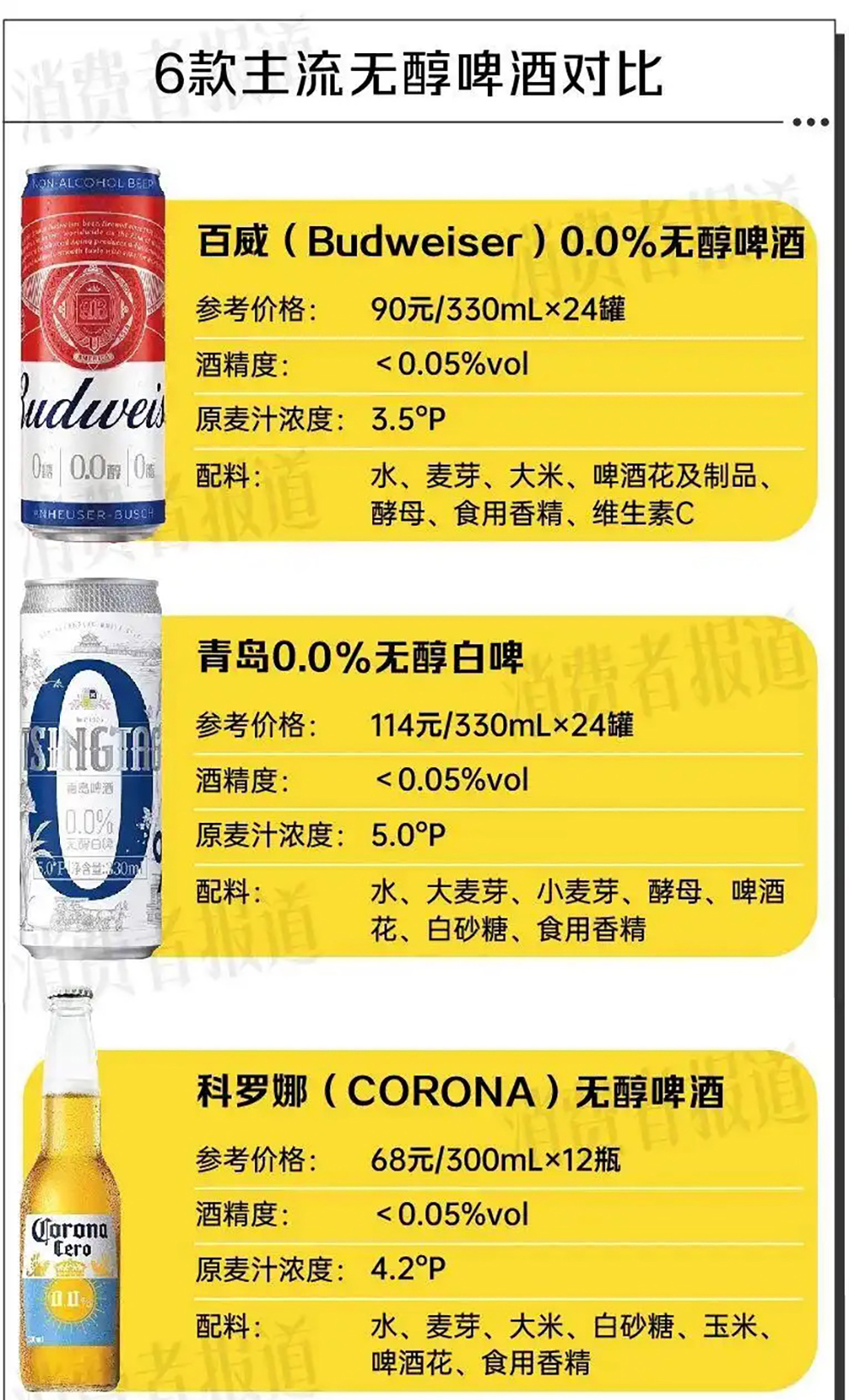 为了了解市售无醇啤酒的原麦汁浓度、酒精度、价格等,《消费者报道》对比了市面上销量较高的6款无醇啤酒,包括百威(Budweiser)0.0%无醇啤酒、青岛0.0%无醇白啤、科罗娜(CORONA)无醇啤酒、新零黄油风味无醇啤酒、燕京无醇啤酒、喜力0.0®啤酒。