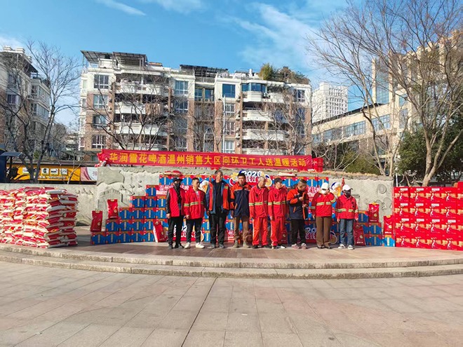 1月26日下午,华润雪花啤酒有限公司在我县中塘溪公园开展“送温暖”活动,向环卫工人们送上春节暖心慰问品。