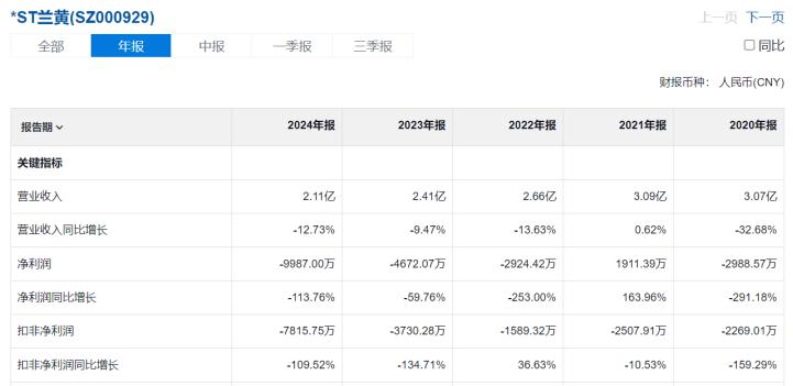 据了解,*ST 兰黄 2024 年经审计的营业收入为 2.11 亿元,低于 3 亿元的标准,同时扣非净利润为 -7815.75 万元,为负值,两项指标同时触发退市风险警示条件,因此在 2025 年 4 月 30 日,公司股票被实施退市风险警示,股票简称变更为 "*ST 兰黄 "。