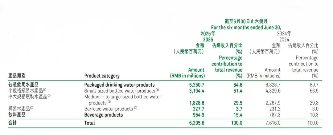 数据直观反映出怡宝的困境。2025年上半年,华润饮料营业收入同比下滑18.52%,归母净利润更是同比大降28.63%。业绩滑坡的核心原因,正是包装水业务的大幅下滑。当期,该公司包装水业务实现收入52.51亿元,较上年同期减少了约15.78亿元。