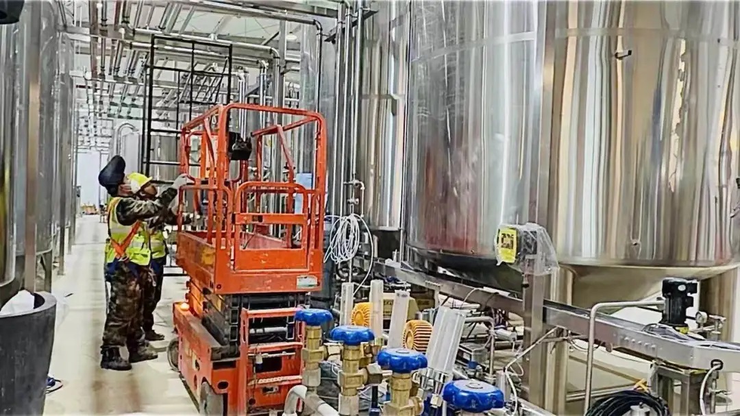 穿过通道,走进酿造车间,控制中心屏幕闪烁,数据实时跳动;银灰色的设备锃亮排列,高大的发酵罐整齐矗立,管线细密延伸。时间在这里酝酿着酒香,也酝酿着产值。张世江指着发酵罐,声音里透着自豪,“我们第一批啤酒,1月底就已经投料,现在正在里面发酵。一个月后,啤酒就能发酵成熟,包装车间也正好建成,第一批成品酒就能上市。”张世江换算了一下,全部达产后,每天将会有200万瓶啤酒从台安发往全国各地。