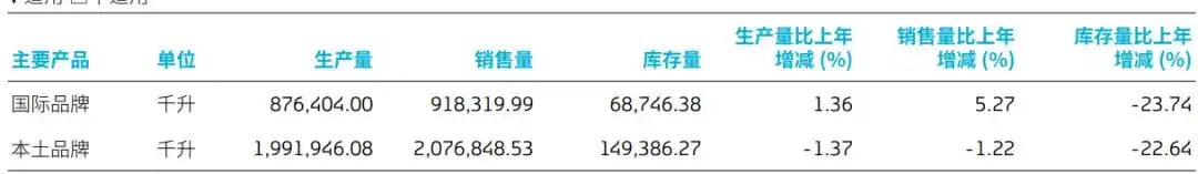 销量方面亦然,本土品牌同比下滑1.22%为207.68万千升;国际品牌同比上升5.27%为91.83万千升。