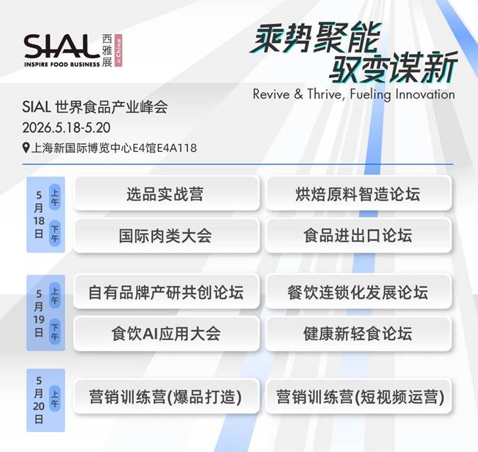 第八届SIAL世界食品产业峰会将以“乘势聚能,驭变谋新”为主题,将密集推出10场聚焦细分领域的主题论坛,包括国际肉类大会、食品进出口论坛、食饮AI应用大会、健康新轻食论坛、营销训练营等。届时,全球知名科学家、品牌创始人与渠道巨头将围绕供应链韧性、贸易新规、技术革命、消费趋势等核心议题展开深度对话,提供穿越周期的破局思路;被誉为全球食饮界奥斯卡的SIAL创新大赛,将基于愉悦、健康、保健、便捷、环保五大维度,评选年度最具创新性的产品,并在展会现场集中展示,是窥探未来爆款的重要窗口。