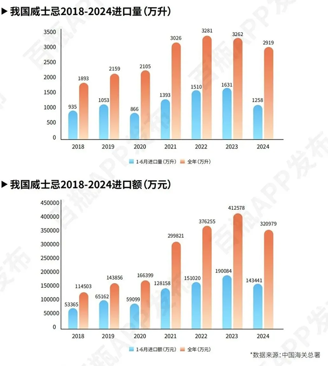 在国际威士忌市场动荡的同时,国产威士忌市场正在不断升温。 数据显示,2018年至2022年,中国威士忌进口量整体稳步上升,但自2023年起,进口量出现明显下降。2024年上半年进口量1258万升,全年进口量仍低于前两年水平,这反映出市场正处于调整期;进口额的下降速度略快于进口量,表明高端威士忌的进口占比可能有所下降,市场或在向性价比更高的产品结构调整。
