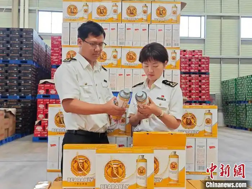 图为海关关员对出口啤酒进行现场查验 孙锐 摄