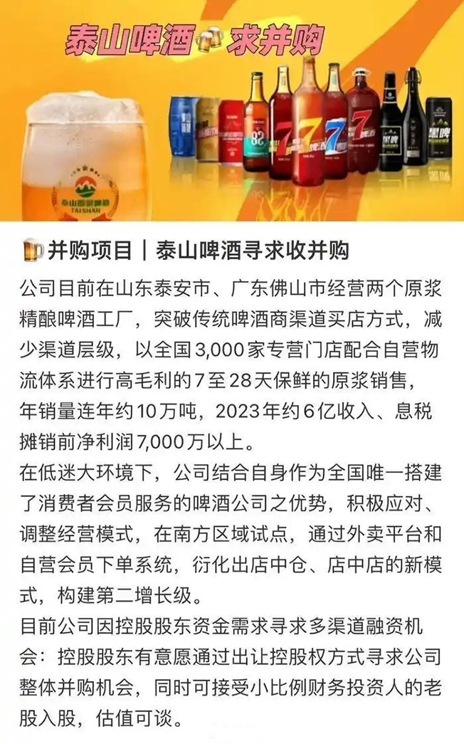 在此背景下,市场出现关于泰山啤酒可能被出售的传言。2024年9月,一名投资人发布的信息显示,泰山啤酒年销量连年约10万吨,2023年约6亿元收入、息税摊销前净利润7000万元以上,“目前公司因控股股东资金需求寻求多渠道融资机会:控股股东有意愿通过出让控股权方式寻求公司整体并购机会,同时可接受小比例财务投资人的老股入股,估值可谈。”记者向该投资人求证收并购一事真伪,对方追问“是否有兴趣并购”。