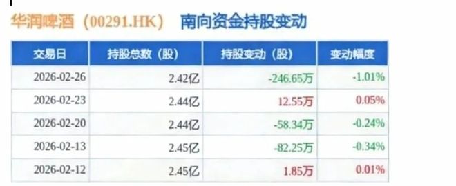 证券之星数据显示,2026年2月底,南向资金减持华润啤酒246.65万股,近5个交易日累计净减持372.84万股;尽管拉长至20个交易日维度,南向资金整体仍呈净增持,但短期连续减持动作,叠加股价前期估值修复后的相对高位,引发了市场的广泛关注。