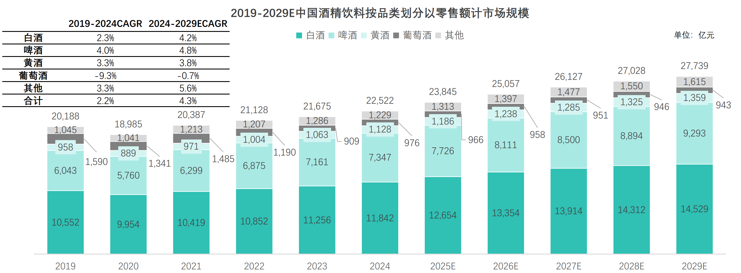 数据显示,2026 年,整个酒精饮料市场的大盘仍在稳步扩容,以零售额计算,2019 年到 2024 年,行业规模从 2.0 万亿元增长至近 2.3 万亿元,复合年增长率 2.2%。市场预测未来五年,这个数字会在 2029 年攀升至近 2.8 万亿元,复合年增长率提升至 4.3%。