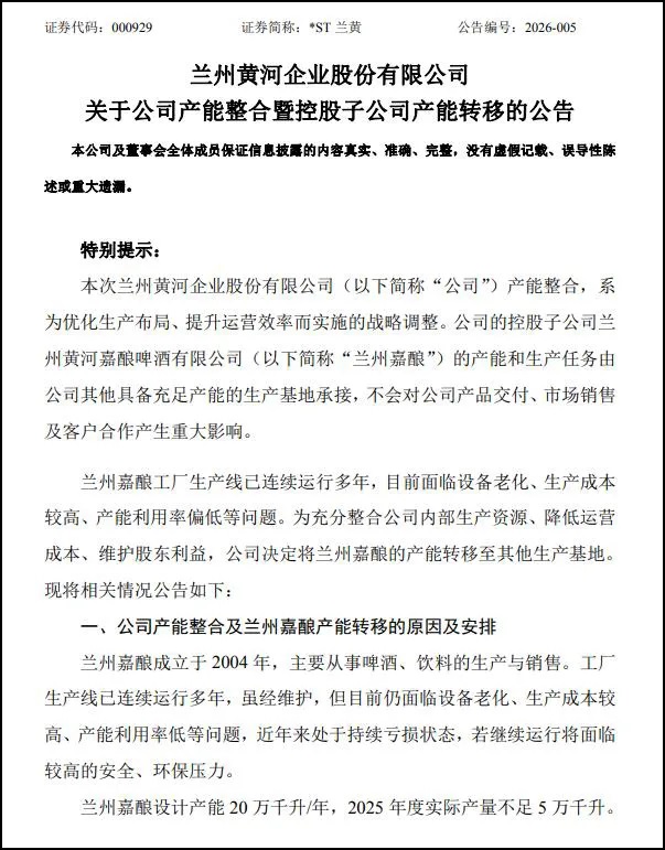 根据*ST兰黄(000929)2月11日发布的公告,为优化生产布局、降低运营成本,公司决定将控股子公司兰州黄河嘉酿啤酒有限公司的产能转移至其他生产基地。