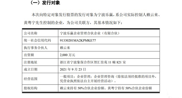 乐惠国际定增发行对象为宁波乐赢企业管理合伙企业(有限合伙),为公司实际控制人赖云来、黄粤宁控制的企业,赖云来、黄粤宁各自持股宁波乐赢50%。