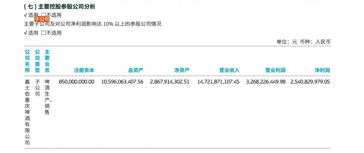 2025年财报显示,嘉士伯重庆为对上市公司净利润影响达10%以上的参股公司,全年营收为147.2亿元,净利润为25.4亿元。重庆啤酒业绩几乎全部来自该子公司。上市公司重庆啤酒整年收入也刚好147.2亿元,与该子公司基本一致。