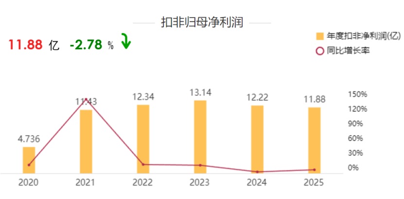 财报数据显示,2025年公司归属于上市公司股东的扣除非经常性损益的净利润为11.88亿元,同比下滑2.78%,这也是公司自2024年出现首次下滑后的再次下滑。