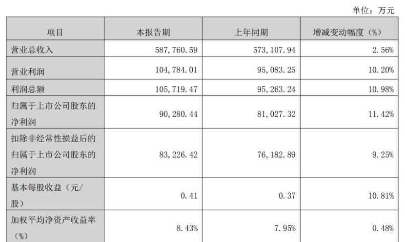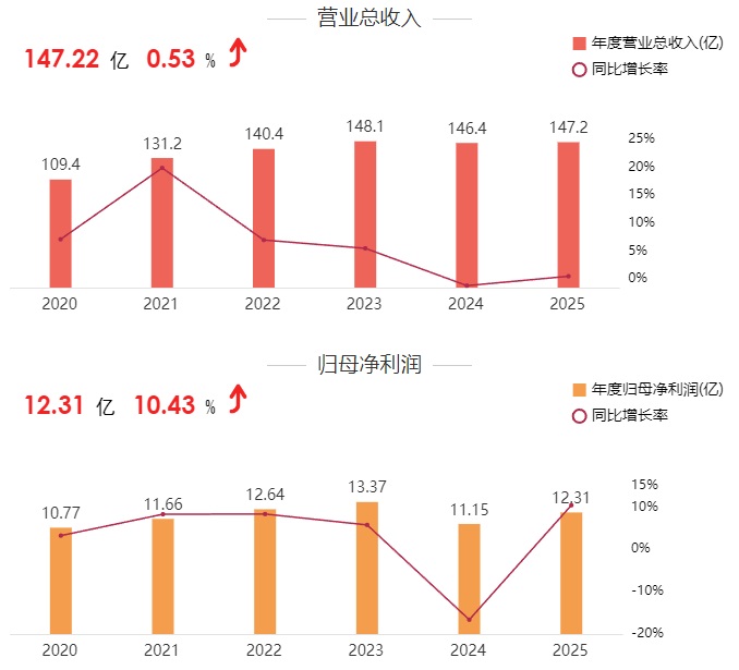 财报显示,2025年公司实现营业收入147.22亿元,同比微增0.53%;实现归属于上市公司股东的净利润12.31亿元,同比增长10.43%。