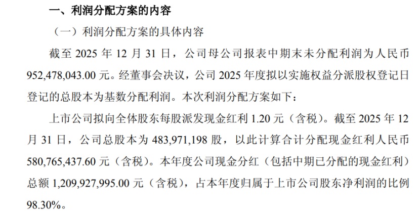 在业绩增长承压的背景下,重庆啤酒延续了对股东的高比例分红政策,展现出较强的回报意愿。根据公司披露的利润分配方案,2025年度拟每股派发现金红利1.20元(含税),合计拟派发年度现金红利5.81亿元,加上2025年中期已派发的6.29亿元现金红利,全年累计现金分红总额达12.10亿元,占当年归母净利润的比例高达98.30%。这也是公司连续第二年维持超90%的分红率,2024年公司现金分红率达104.21%。