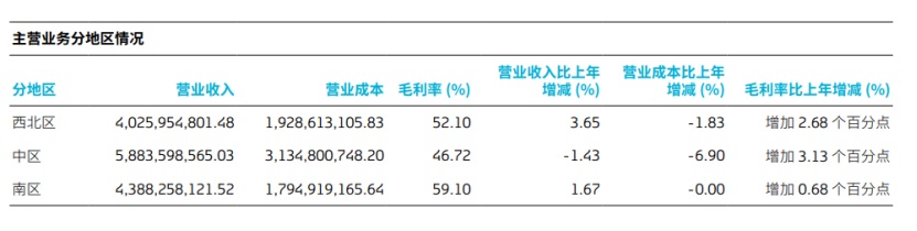 毛利率方面,三大区域同样差异显著,南区毛利率达59.10%,中区毛利率仅为46.72%,区域间盈利水平差距明显。