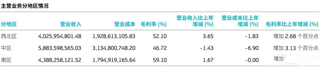 区域市场方面,重庆啤酒将全国市场划分为西北区、中区、南区三大板块,2025年三大区域表现呈现明显差异,西北区域受益于旅游市场带动,营收同比增长3.65%至40.26亿元;南区受益于嘉士伯品牌的良好表现,实现营收43.88亿元,同比增长1.67%;而作为核心市场的中区,以重庆大本营为核心,实现营收58.84亿元,同比减少1.43%,已连续两年出现营收负增长,2024年中区营收同比降幅为1.88%,核心市场的承压态势明显。
