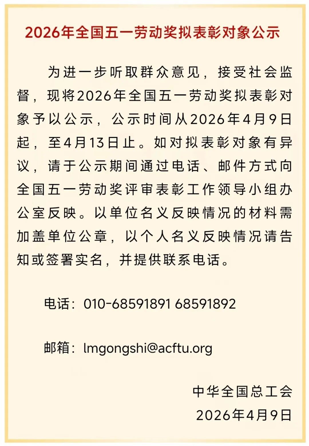 4月9日,中华全国总工会发布通知,对2026年全国五一劳动奖拟表彰对象进行公示。拟表彰荣誉包括全国五一劳动奖状、全国五一劳动奖章、全国工人先锋号三个类别。公示时间从2026年4月9日起,至4月13日止。这些酒业集体、个人在列(排名不分先后)。