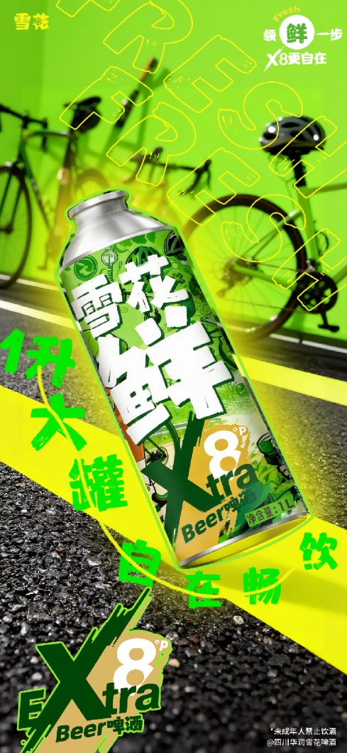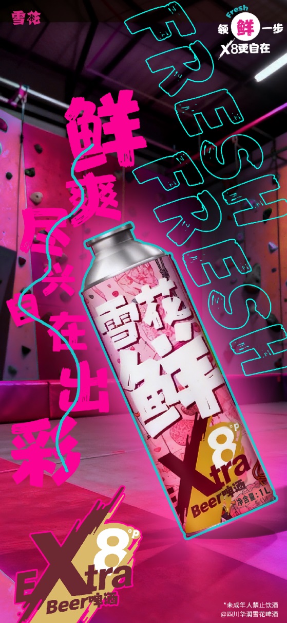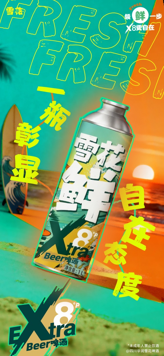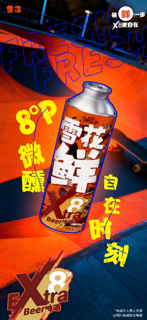 作为“雪花鲜”这一颇受好评品牌的价值延伸,雪花鲜X8以“领鲜一步,X8更自在”为产品口号,聚焦当代年轻人对于情绪的表达,和对自我风格的张扬与诠释。雪花鲜X8跳脱出传统啤酒的功能定位;以“自在态度”与“自在畅饮”的姿态进入市场,为畅饮型年轻群体打造全新潮流单品。